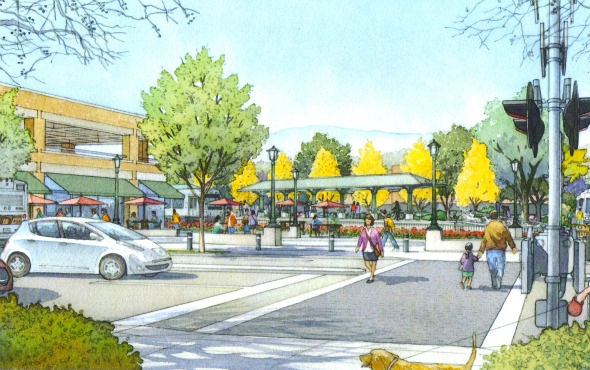 Aritist rendering of transit plaza to be built on northwest corner of intersection at First Avenue and Santa Clara Ave, with two-level expandable parking garage on left (west) and one of two awnings on station platform at center (north) in middle of tracks.